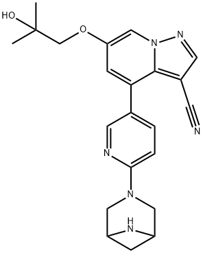 中文名稱: 4-(6-(3,6-二氮雜雙環(huán)[3.1.1]庚烷-3-基)吡啶-3-基)-6-(2-羥基-2-甲基丙氧基)吡唑并[1,5-a]吡啶3-甲腈